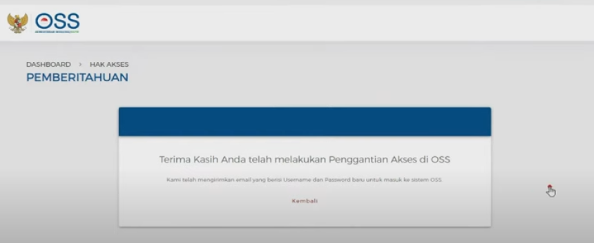 Setelah saya mencoba Ubah Hak Akses di sistem OSS, dan memasukkan nomor SKT Pengesahan Perusahaan yang baru ini, saya berhasil mengirim data, dan muncul halaman seperti ini :