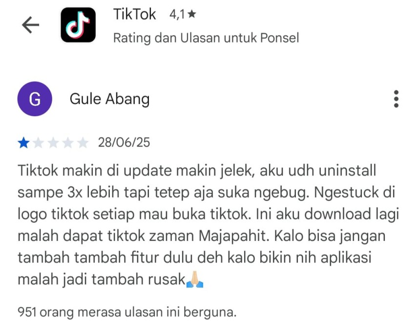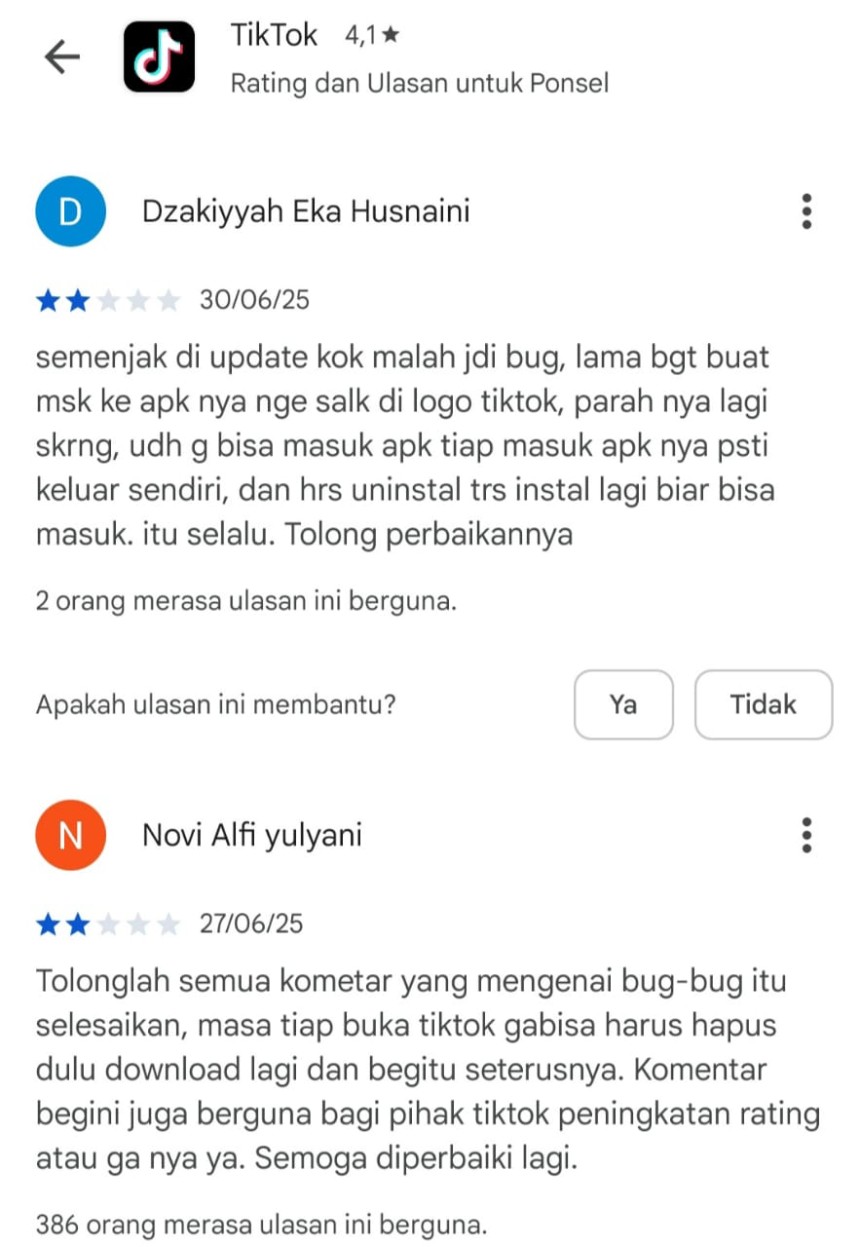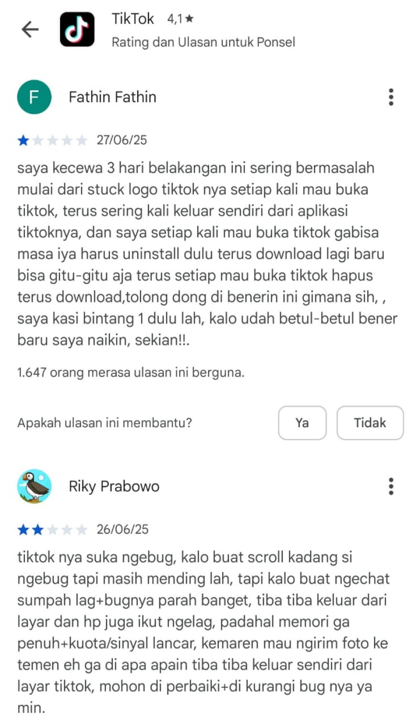 Dan ini memang masalah di aplikasi Tiktok yang belum tersesaikan. Ini adalah bukti komentar - komentar para pengguna aplikasi Tiktok di Google Play store. Semoga masalah ini dapat cepat diselesaikan oleh pihak pengembang aplikasi Tiktok. Sehingga pengguna Tiktok dapat tetap menggunakan aplikasi Tiktok dengan lancar.