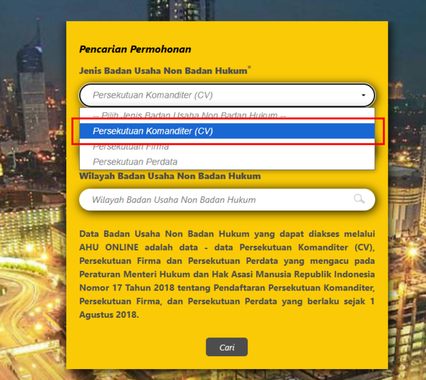 Untuk mengecek apakah Perusahaan CV (Commanditaire Vennootschap) di situs Kemenkumham online https://ahu.go.id, perlu mengakses sub menu Perusahaan CV pada halaman pencariannya. Sub menu ini terletak agak tersembunyi sehingga biasanya jika mengecek Perusahaan CV di situs online AHU ini, perusahaan CV tidak ditemukan, meskipun Perusahaan CV sudah memiliki Nomor SKT Pengesahan Kemenkumham.